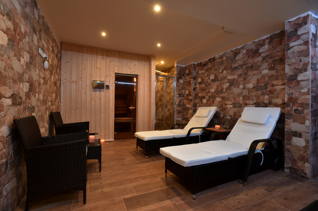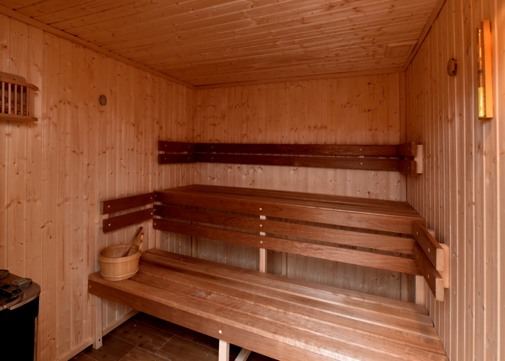 Finskou saunu , ochlazování ,,horským proudem" a výklopným vědrem, kneipovu lázeň a odpočívárnu, ochlazovací bazének se slanou vodou, masáže (viz. sauny.