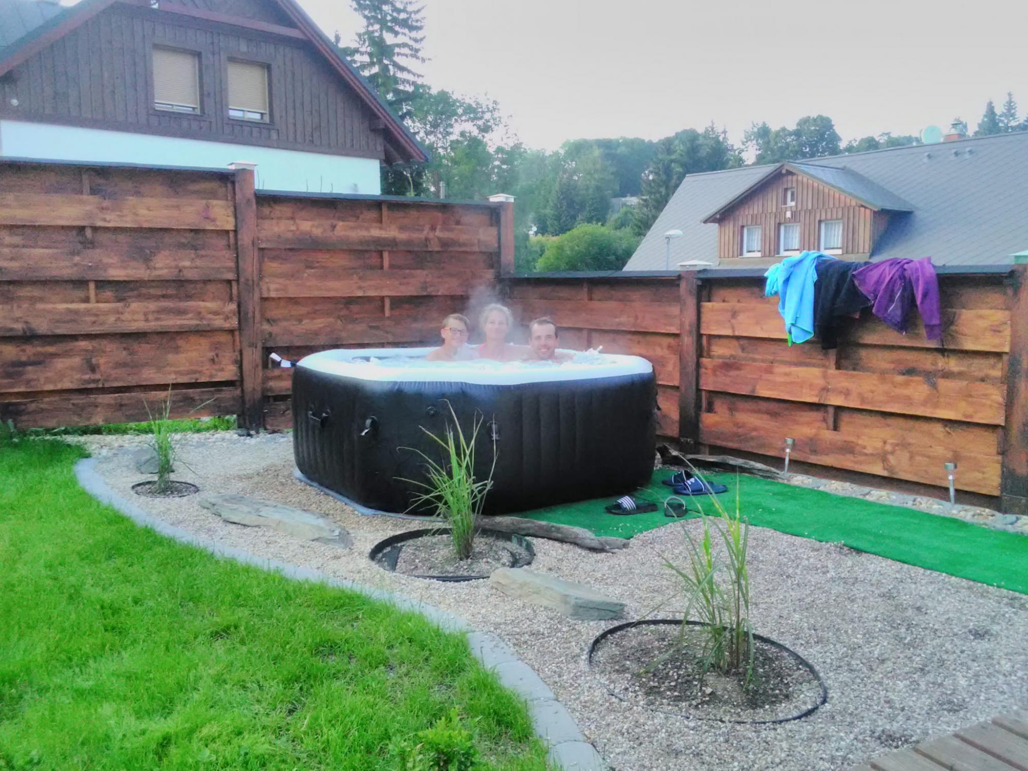 Bar, slunnou terasu a zahradu s ohništěm,pinpongový stůl . pískoviště pro děti, kolárna, letní ochlazení venkovní sprchou a vářivku se slanou vodou.